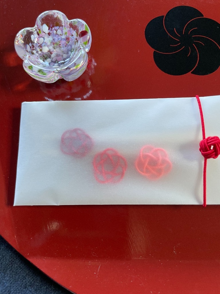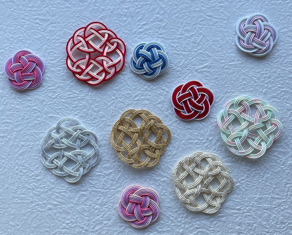 写真は梅結びと袈裟結びです。袈裟結びはお坊さんの袈裟の装飾をもとにしている結び方で、大変ありがたい結び方。梅結びは、寒くて長い冬に耐えて春先に花を咲かせるため、おめでたい結びとされています。どちらもお正月にふさわしい結びです。