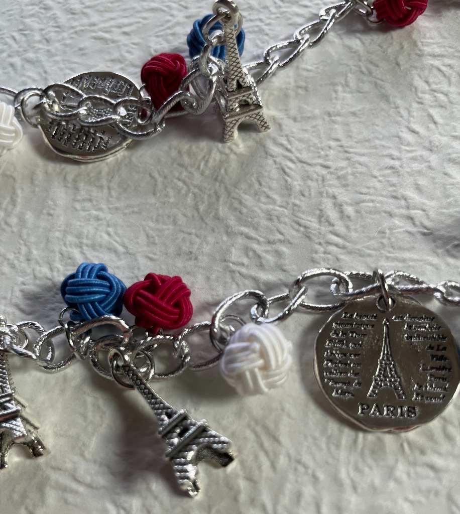 ということで、Japan Expo Parisの無事開催を祈りつつネックレスを作ってみました。トリコロールParis。エッフェル塔モチーフのチャームにエッフェル塔模様のコイン、それにフランス国旗の赤白青の水引で作った玉結びで彩りを添えてみました。赤と青の水引はちょい渋めな色あいなので、ジャラジャラとチャームがついている割には落ち着いた感じになりました。