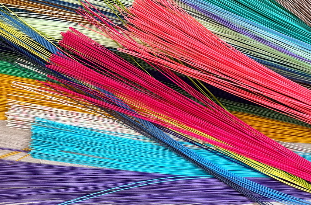 水引は、まず薄い和紙を撚って棒状の芯の芯にします。それをのりで固め、周りを細い糸で巻き付けたら水引のできあがり。つまり材料は紙と糸。その糸の素材によって、いろいろな表情が生まれます。